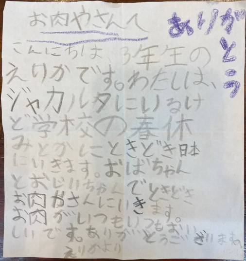 先日、インドネシアから帰省されファミリーで食事に来ていただきました。とっても嬉しくって勇気が出てきます。えりかちゃんありがとう(^^♪